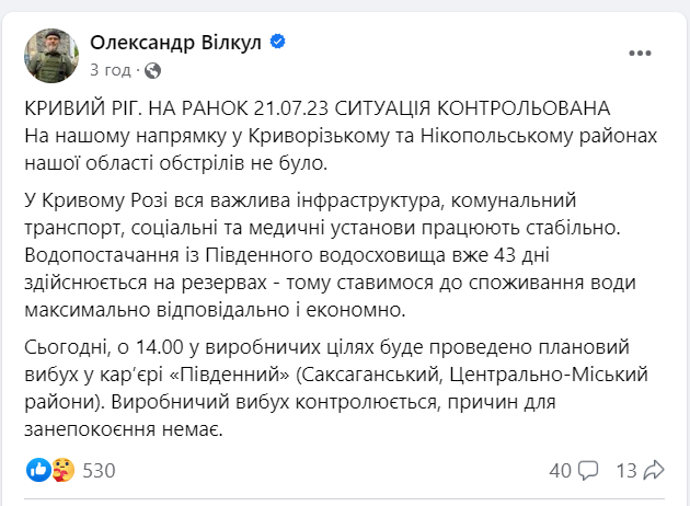 Так, у Кривому Розі о 14:00 у виробничих цілях буде проведено плановий вибух у кар’єрі «Південний» (Саксаганський, Центрально-Міський райони).