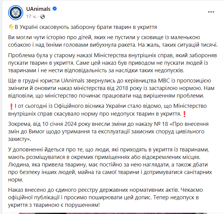 І от із Офіційного вісника України стало відомо, що Міністерство внутрішніх справ скасувало норму про недопуск тварин в укриття. Зокрема, від 10 січня 2024 року внесли зміни до наказу №18 «Про внесення змін до Вимог щодо утримання та експлуатації захисних споруд цивільного захисту», - повідомили зоозахисники.
