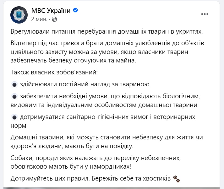 У МВС уточнили, яких правил мають дотримуватися власники тварин під час перебування в укриттях (див. на фото):