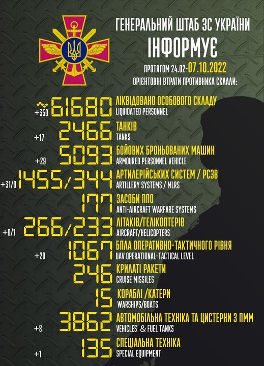Загальні бойові втрати противника з 24.02 по 07.10 орієнтовно склали: