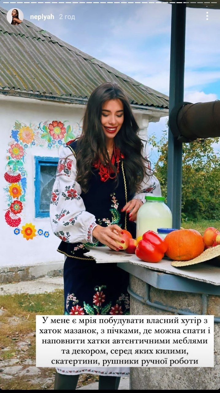 Анна каже, що мріє колись створили власний мініхутір з традиційними хатинками, де можна зберігати автентичний посуд, рушники та інші предмети побуту. Дівчина попозувала в українському вбранні на фоні петриківської мазанки.