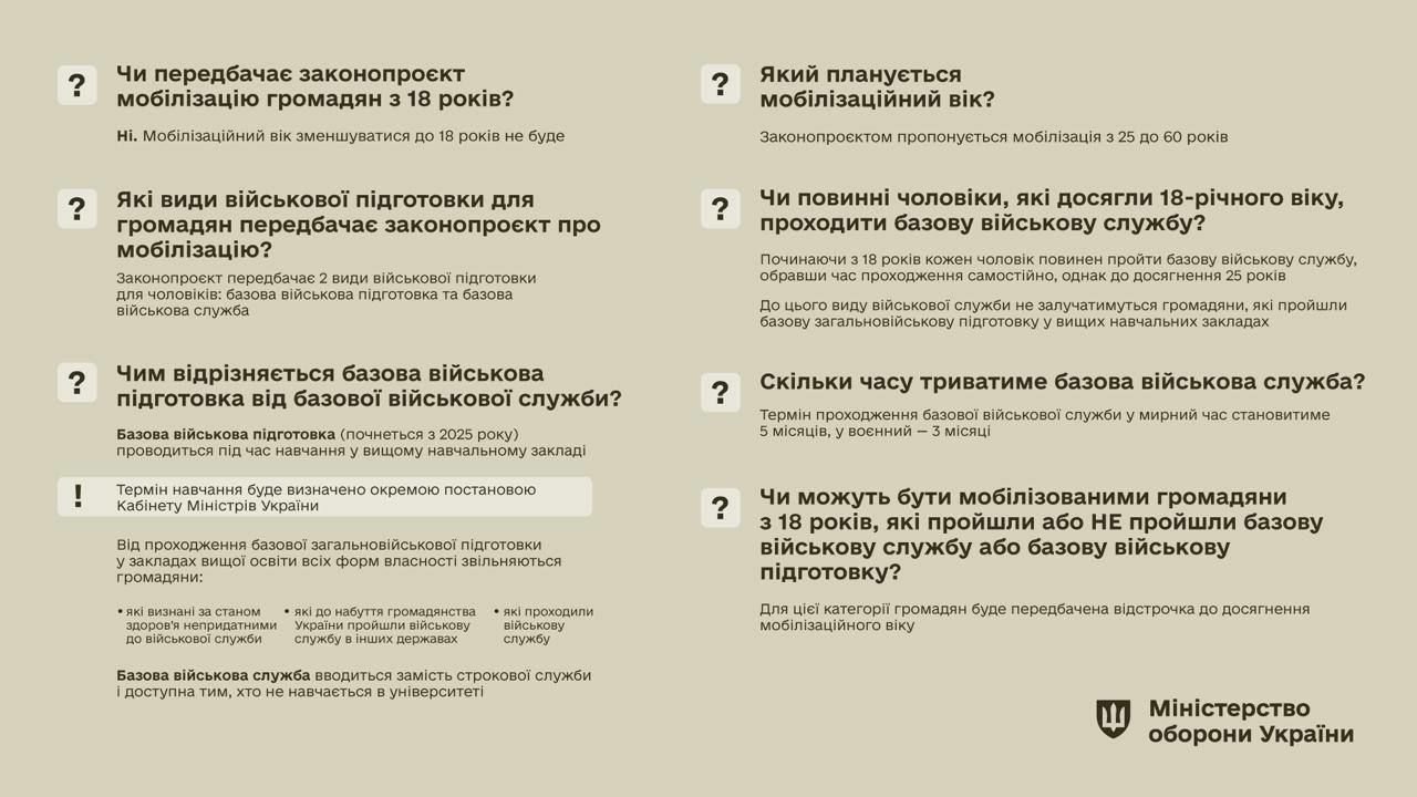 У Міноборони роз'яснили основні положення нового закону про військовий вишкіл. Мобілізації з 18 років не буде, пропонується, що призвати на службу можуть від 25 до 60 років, а з 2025 року у вищих навчальних закладах запроваджується базова військова підготовка. Від її проходження звільняються деякі категорії громадян.