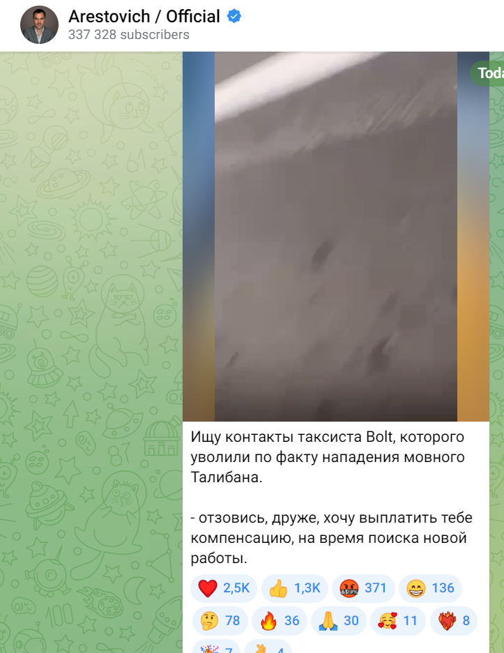 А Олексій Арестович попросив підписників допомогти знайти йому таксиста, якого "звільнили по факту нападу мовного Талібана", щоб виплатити компенсацію.