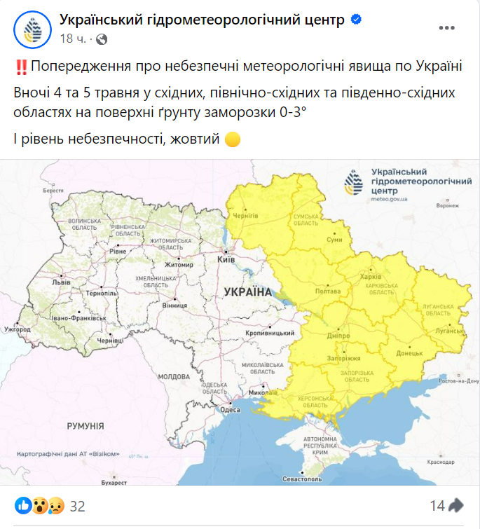 4 та 5 травня в Україні спостерігатимуться відчутні заморозки. У зв'язку із цим синоптики оголосили жовтий рівень небезпеки.