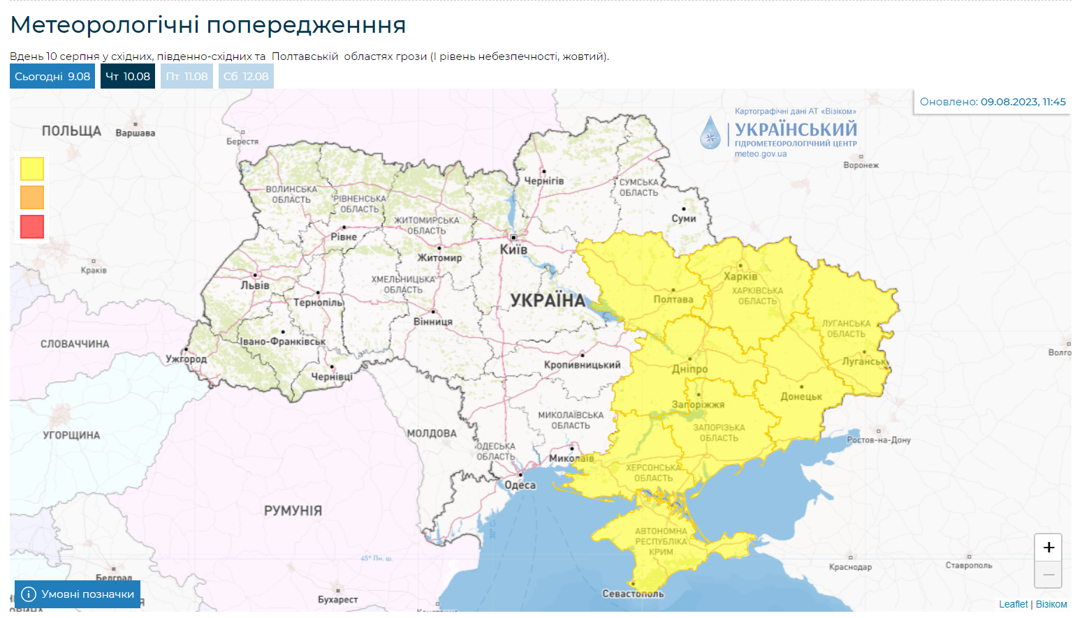 Вдень 10 серпня у східних, південно-східних та Полтавській областях грози (І рівень небезпечності, жовтий), - йдеться у повідомленні Укргідрометцентру.