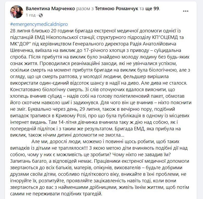 Увечері 28 липня надійшов виклик до "швидкої" про хлопця, що намагався вкоротити собі віку. Приїхавши за адресою, фельдшери побачили юнака без ознак життя. Медики розпочали реанімаційні заходи, але на жаль, усі спроби повернути підлітка до тями були марними.