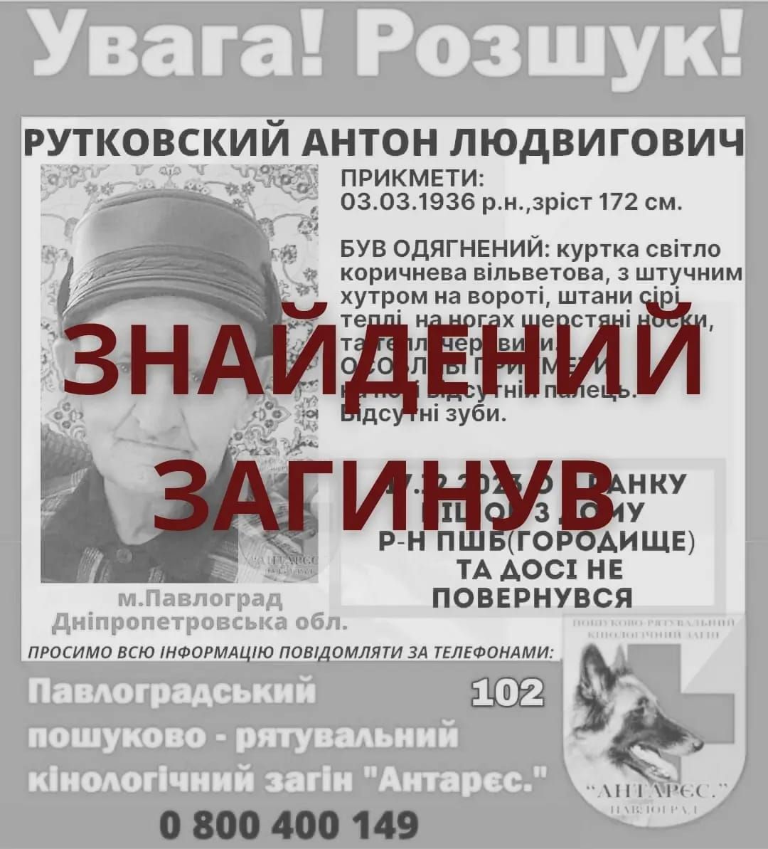 У Павлограді з 17 грудня розшукували безвісти зниклого 87-річного Рутковського Антона Людвиговича. До пошуків дідуся залучили правоохоронців, волонтерів кінологічного загону "Антарєс" та небайдужих людей.