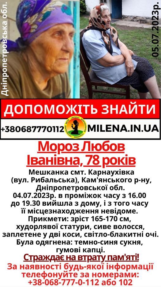 Якщо ви бачили бабусю або знаєте, де вона може бути, повідомте про це за номером: 068-777-01-12.