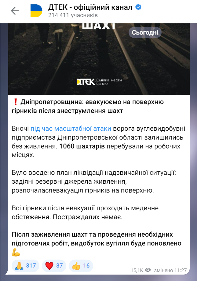 Під час масштабної атаки ворога вуглевидобувні підприємства Дніпропетровської області залишились без живлення. 1060 шахтарів перебували на робочих місцях. Було введено план ліквідації надзвичайної ситуації: задіяні резервні джерела живлення, розпочалася евакуація гірників на поверхню, - зазначили в компанії.