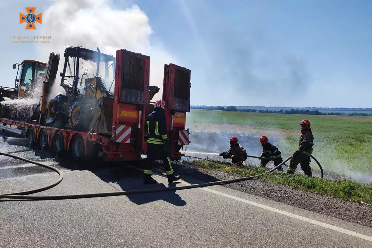Сьогодні, 15 серпня, на узбіччі траси поблизу селища Дмитрівка Нікопольського району загорівся вантажний причіп, на якому знаходилися два трактори JCB.