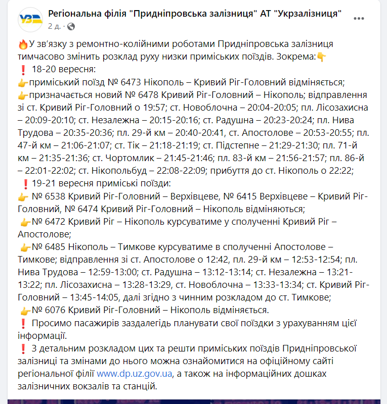- приміський поїзд № 6472 Кривий Ріг – Нікополь курсуватиме у сполученні Кривий Ріг – Апостолове;