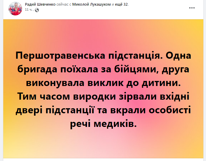 За його словами, одна із бригад поїхала забирати поранених бійців, а інша виконувала виклик до дитина. Тим часом, невідомі скористались тим, що на підстанції нікого не було, виламали двері і вкрали особисті речі медиків. Радій Шевченко зазначив, що на місці вже працюють правоохоронці.