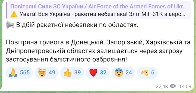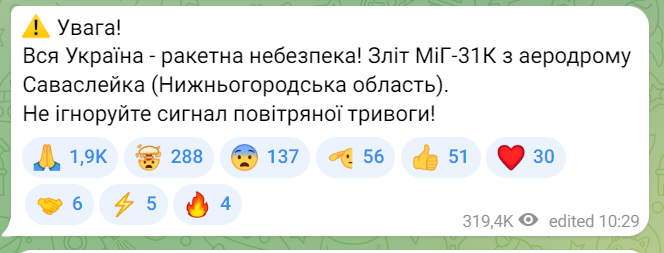 Оновлено: МіГ-31К приземлився, але в Дніпропетровській області тривога триває через загрозу застосування балістичного озброєння, повідомили у Повітряних силах!