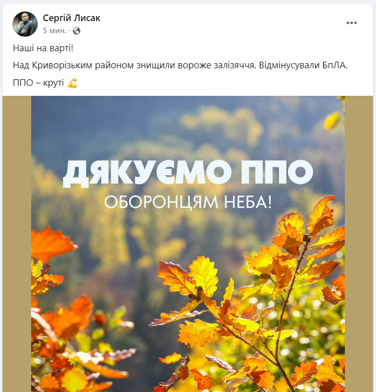 Над Криворізьким районом знищили вороже залізяччя. Відмінусували БпЛА, - написав він.