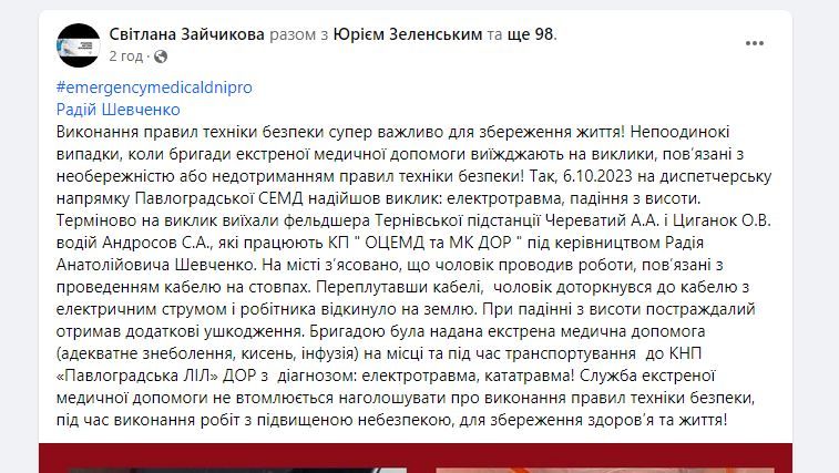 Так, 6 жовтня до диспетчерської Павлоградської СЕМД надійшов виклик: електротравма, падіння з висоти. На місце виїхала бригада швидкої.