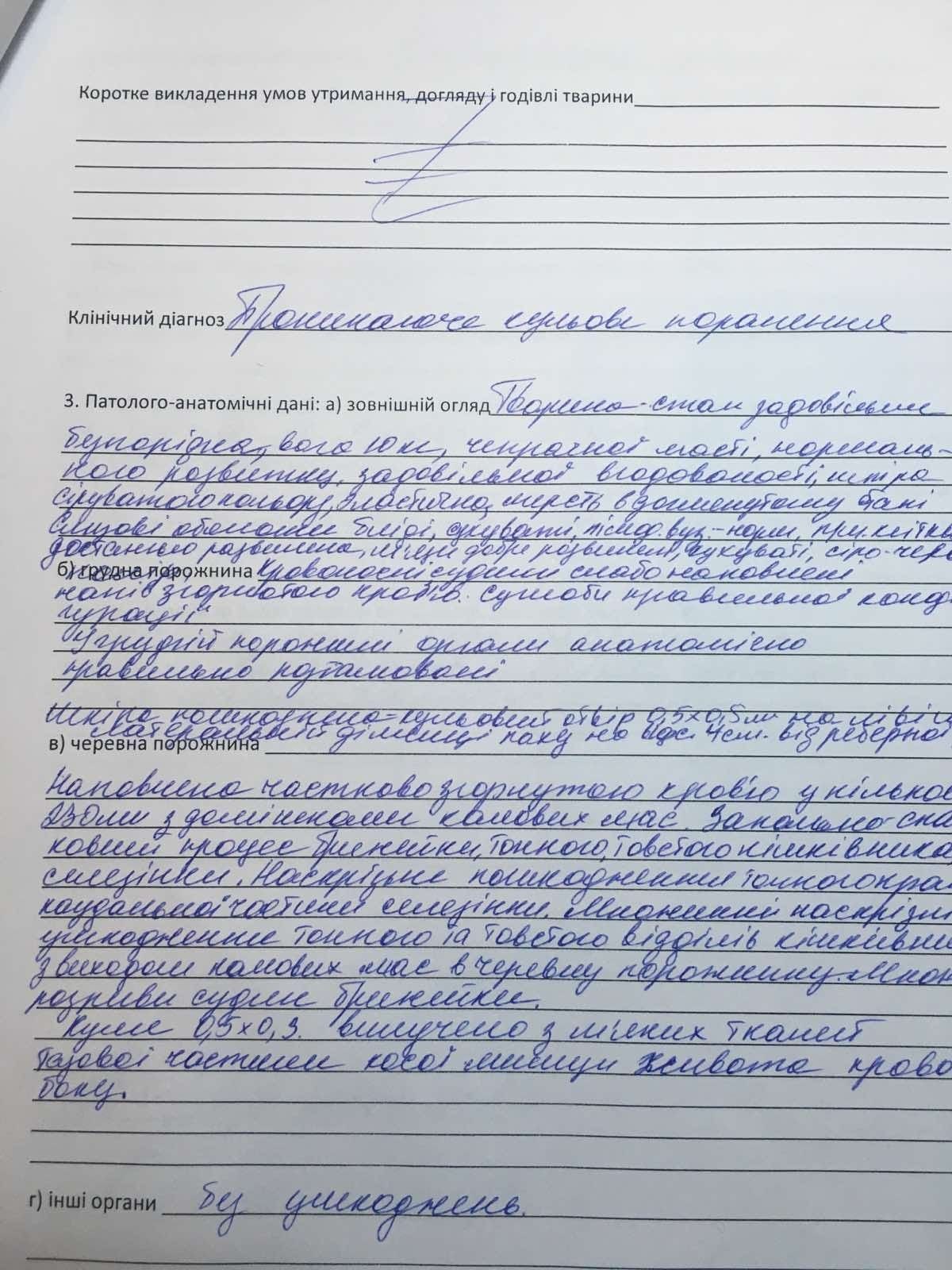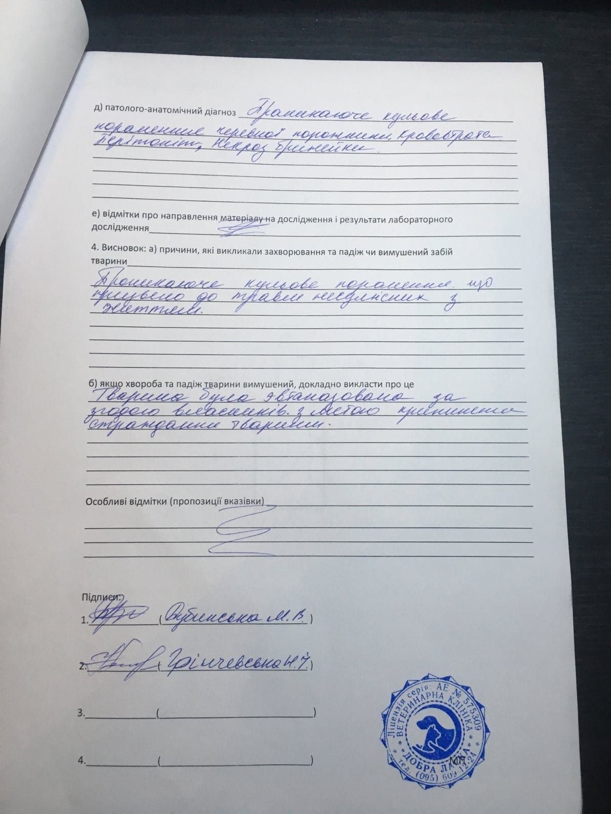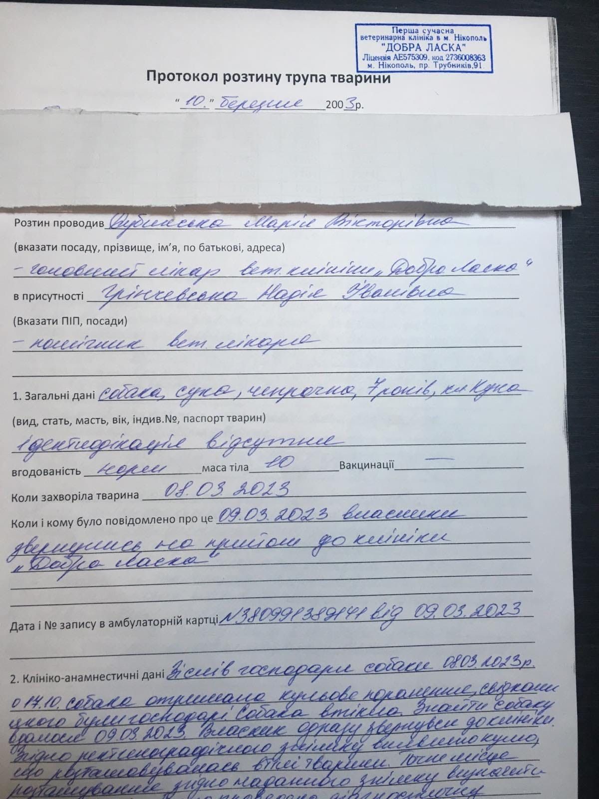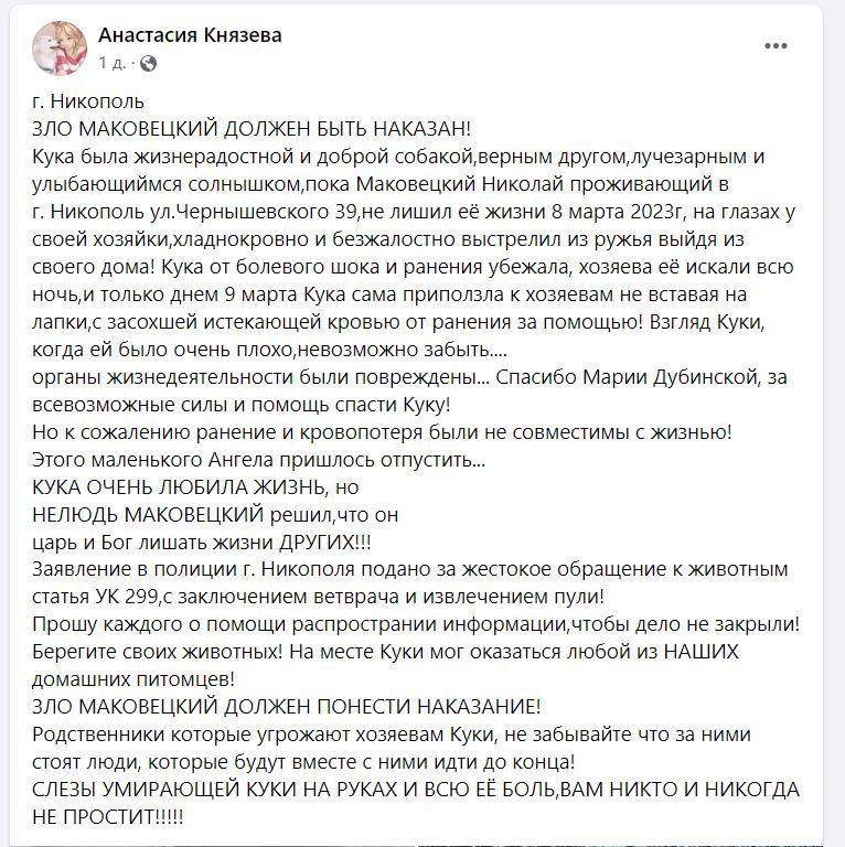 Волонтерка зазначила, що собаку звати Кука, вона не була агресивною, а навпаки поводилася добре та слухалася власників. Тварину відвезли до ветеринара, але попри усі зусилля медиків, вона померла. Чотирилапа отримала складні поранення внутрішніх органів та втратила багато крові.