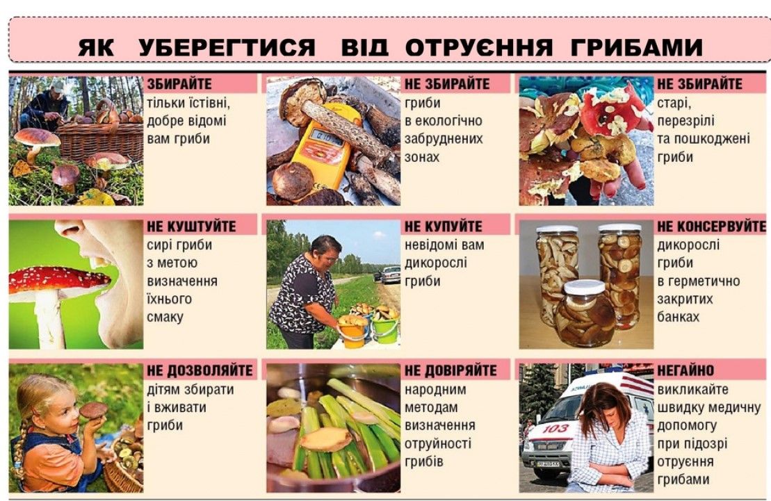 - відмовитися від споживання дикорослих грибів. Краще їжте штучно вирощені печериці, гливи, купуючи їх у стаціонарних торговельних мережах з відповідним виробничим маркуванням;