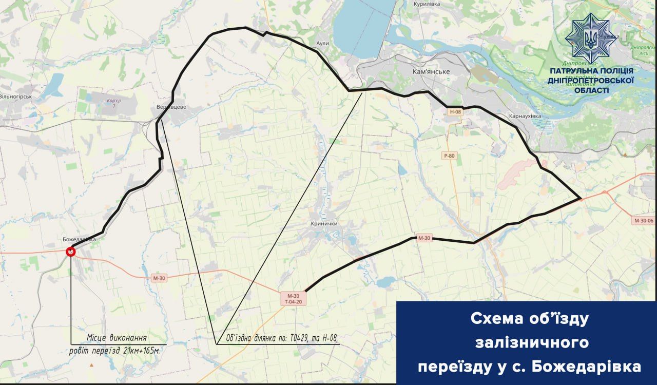 27 та 28 квітня у зв’язку з ремонтом залізничного переїзду в районі села Божедарівка Кам'янського району вводиться тимчасове обмеження руху транспорту автодорогою М-30.