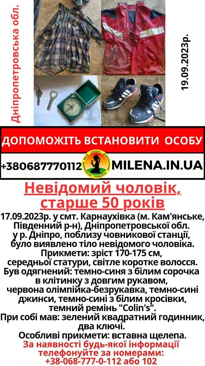 17 вересня у смт. Карнаухівка (м. Кам'янське, Південний район) в річці Дніпро виявили тіло чоловіка, на вигляд йому більше 50 років.