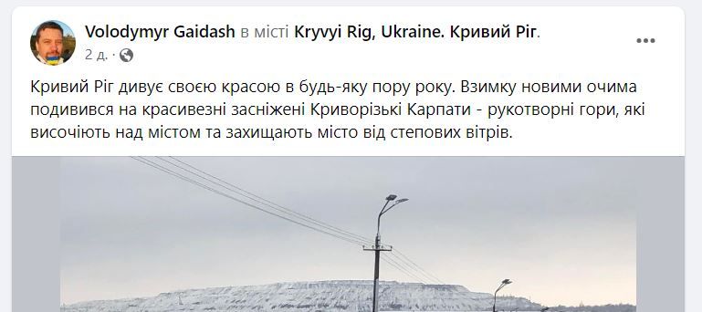 Кривий Ріг дивує своєю красою в будь-яку пору року. Взимку новими очима подивився на красивезні засніжені Криворізькі Карпати - рукотворні гори, які височіють над містом та захищають місто від степових вітрів, - пише криворіжець.