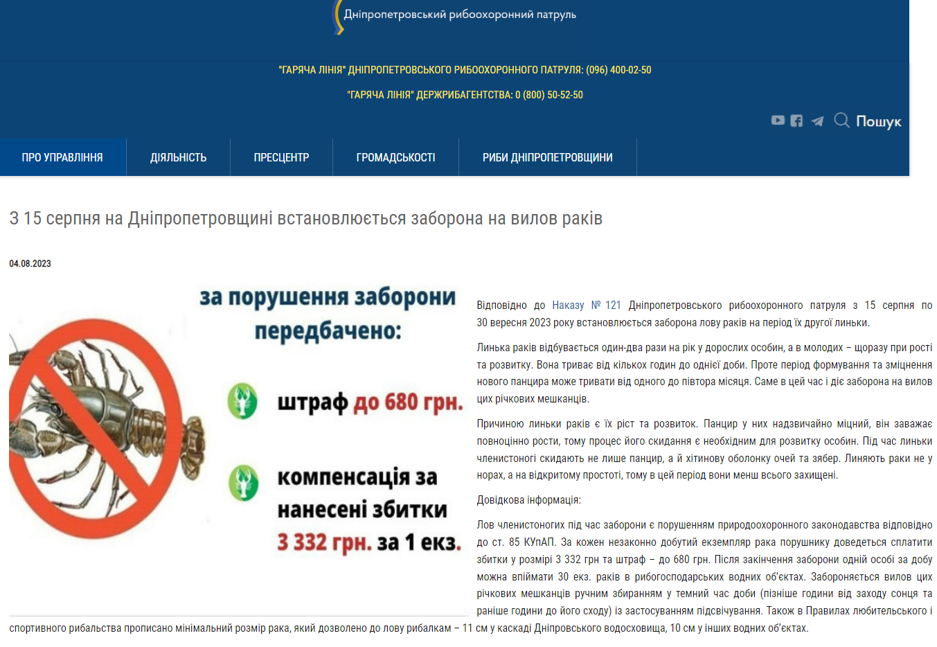 Зазначається, що обмеження діятимуть до 30 вересня, тобто на період другої линьки раків.