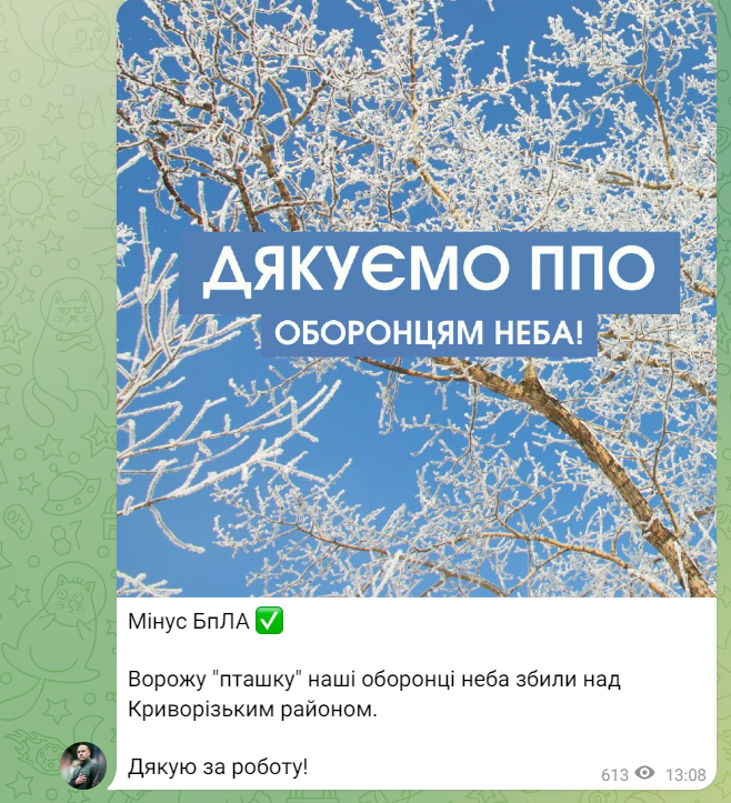 Мінус БпЛА. Ворожу "пташку" наші оборонці неба збили над Криворізьким районом. Дякую за роботу! - написав Лисак.