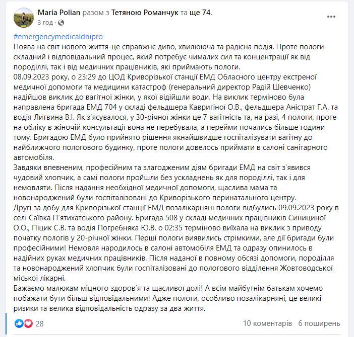 Як зʼясувалося, у 30-річної жінки це 7 вагітність та 4 пологи, проте на обліку в жіночій консультації вона не перебувала, а перейми почались понад годину тому. Бригадою ЕМД було прийнято рішення якнайшвидше госпіталізувати вагітну до найближчого пологового будинку, проте пологи довелось приймати в салоні санітарного автомобіля.
