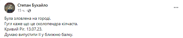 Була зловлена на городі. Гугл каже, що це сколопендра кільчаста. Кривий Ріг. 13.07.23. Думаю, випустити її у ближню балку, - написав він.