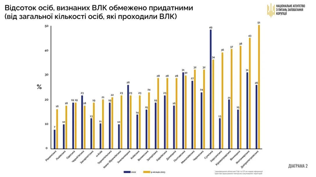 Лише за 9 місяців 2023 року відсоток обмежено придатних зріс до 51. У 2022 році цей показник складав 26%, йдеться в інфографіці від НАЗК. Значно збільшилася кількість призовників, яких визнали повністю непридатними. Було 6% від загального числа людей, які пройшли ВКЛ, а тепер - 13%.