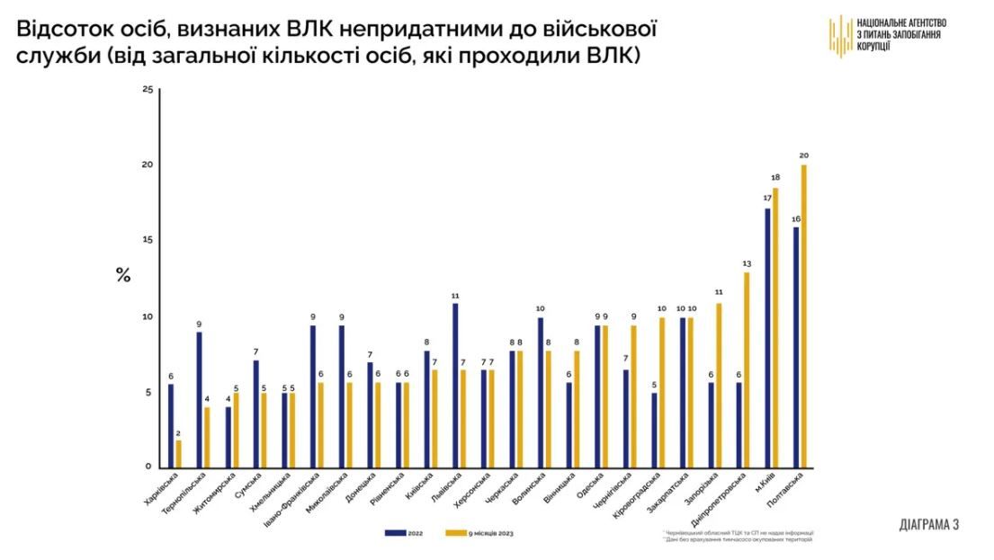 Як виявилося, у 2023 році значно зросла кількість людей, які можуть вважатися непридатними до військової служби за результатами ВКЛ. Зокрема, у Дніпропетровській області ці показники чи не найвищі в Україні. Для дослідження НАЗК використовувало дані від обласних ТЦК та СП.