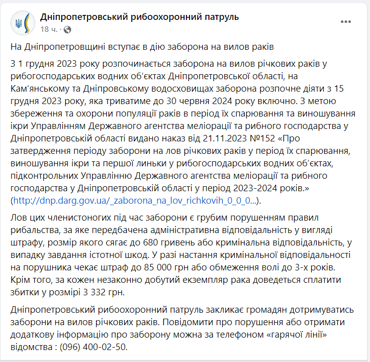 З 1 грудня 2023 року на Дніпропетровщині вступає в дію заборона на вилов раків у рибогосподарських водних об’єктах. На Кам’янському та Дніпровському водосховищах заборона розпочне діяти з 15 грудня 2023 року. Триватиме вона до 30 червня 2024 року включно.