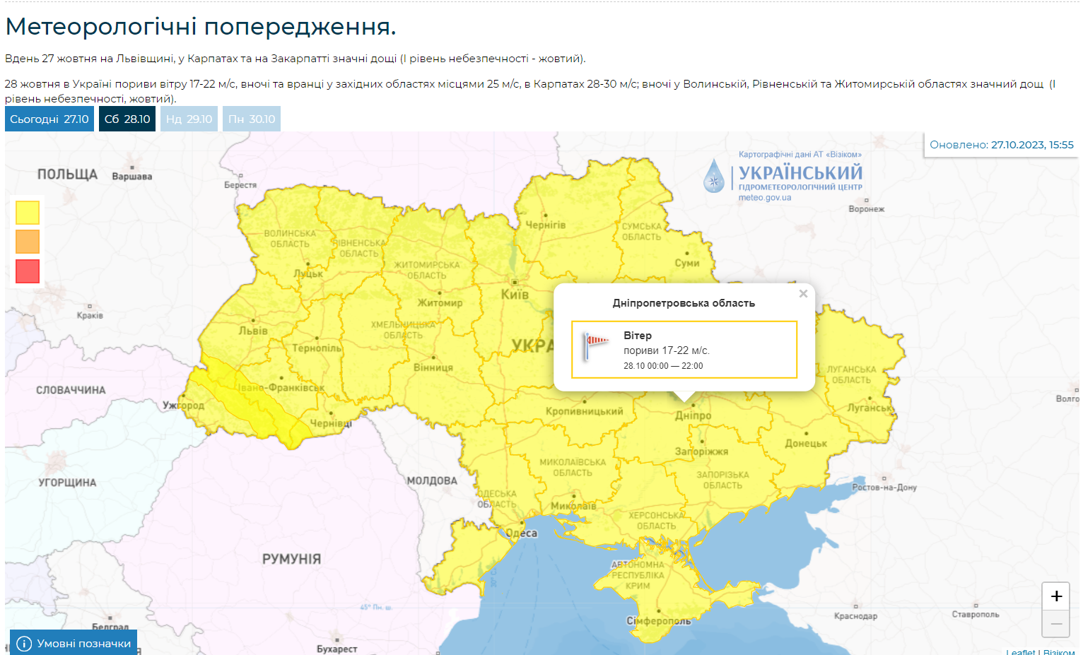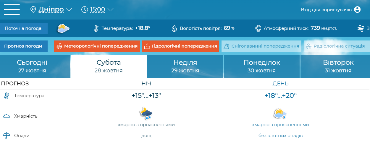 28 жовтня в Україні пориви вітру 17-22 м/с, вночі та вранці у західних областях місцями 25 м/с, в Карпатах 28-30 м/с; вночі у Волинській, Рівненській та Житомирській областях значний дощ (I рівень небезпечності, жовтий), - йдеться у повідомленні.