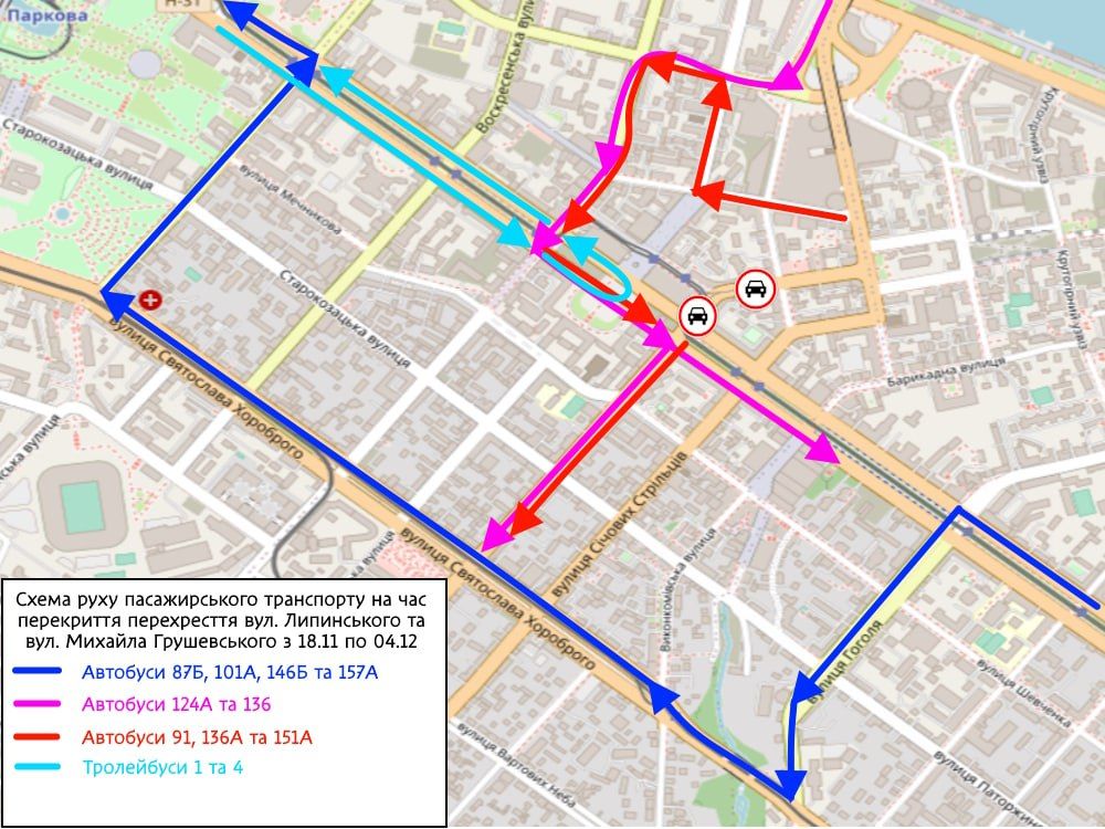 - тролейбусні маршрути № 1 та № 4 буде скорочено до пл. Героїв Майдану;