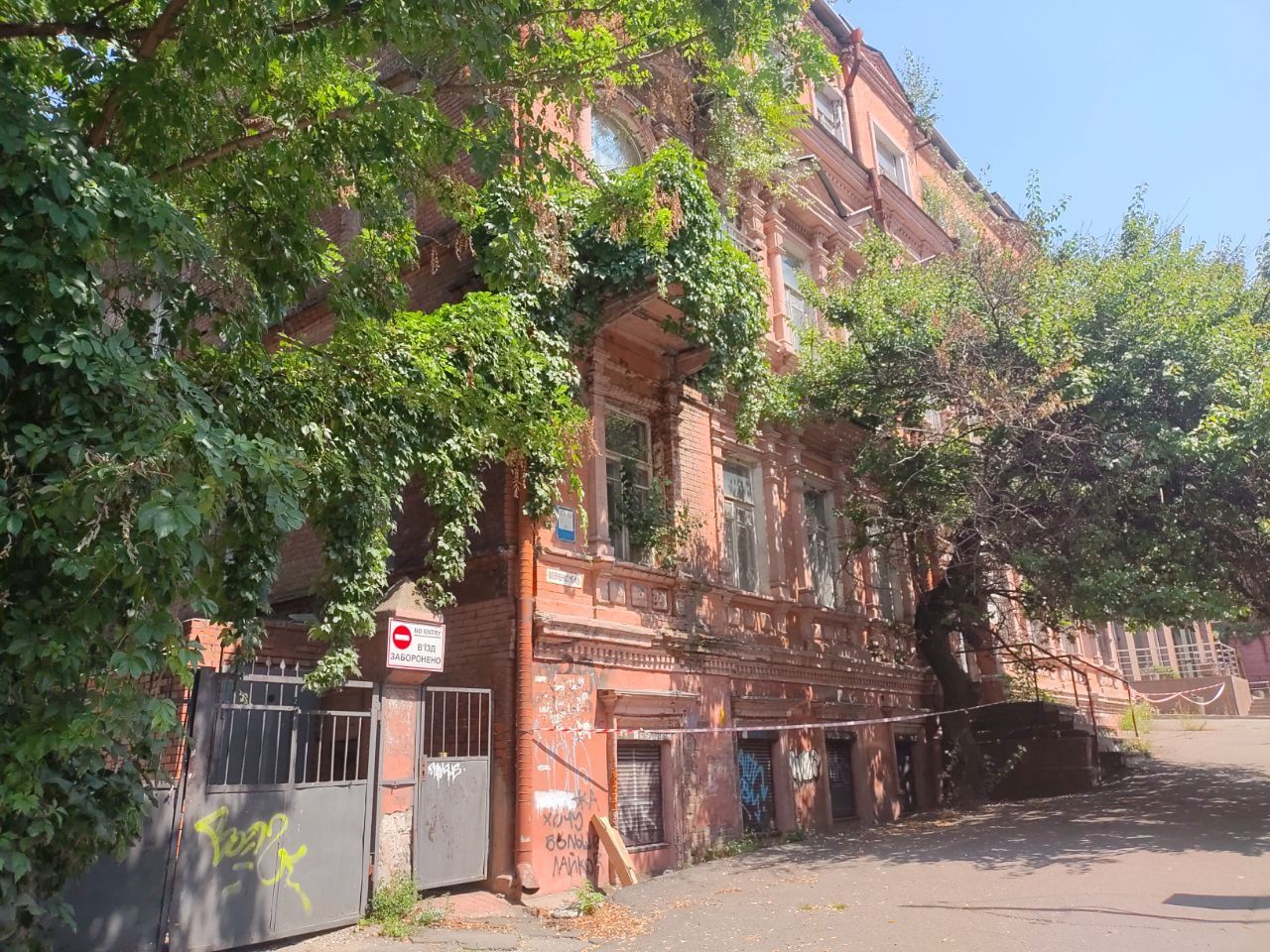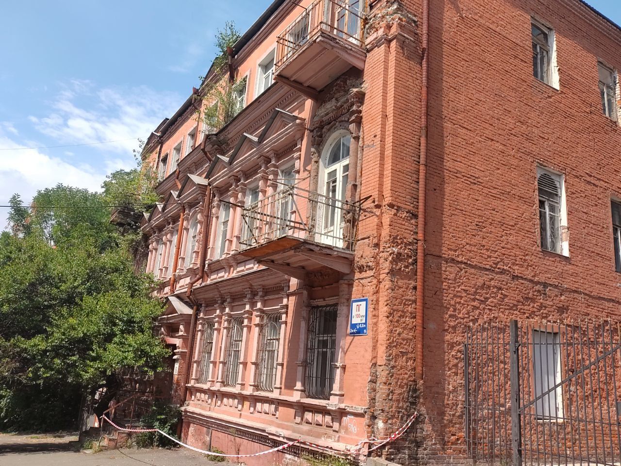 На верхніх поверхах будівлі ростуть дерева. На вікнах нижніх поверхів стоять ґрати та ролети.