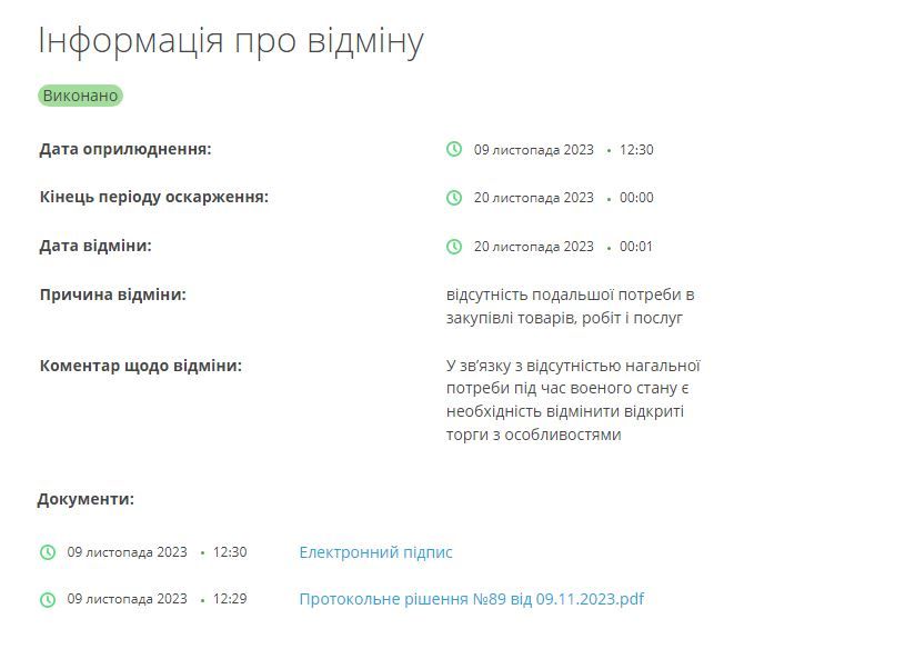 І ось, 20 листопада тендер скасували. Як йдеться у поясненні, це сталося через відсутність подальшої потреби в закупівлі товарів, робіт і послуг.