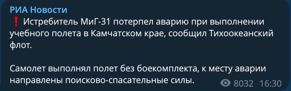Винищувач МіГ-31 зазнав аварії під час виконання навчального польоту в Камчатському краї, повідомив Тихоокеанський флот. Літак виконував політ без боєкомплекту, до місця аварії направлено пошуково-рятувальні сили, - пишуть рашаЗМІ.