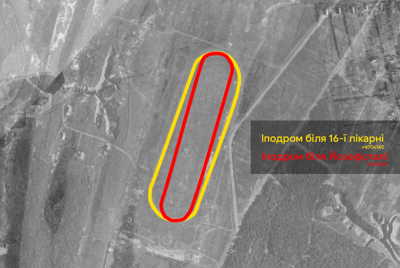 Сліди іподрому (?) біля Йозефсталі? У 1941-му році об'єкт ще видно, але на більш пізніх знімках текстури втрачаються. На третій ілюстрації показано відомий іподром біля 16-ї лікарні у тому ж масштабі. Об'єкти відрізняються - той, що біля Йозефсталі трохи іншої форми, але такий самий по довжині, - пише Артем.