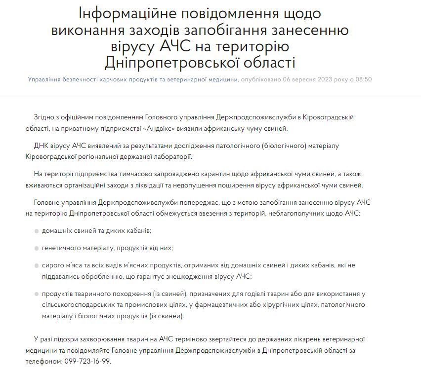Головне управління Держпродспоживслужби попереджає, що з метою запобігання занесенню вірусу АЧС на територію Дніпропетровської області обмежується ввезення з територій, неблагополучних щодо АЧС: