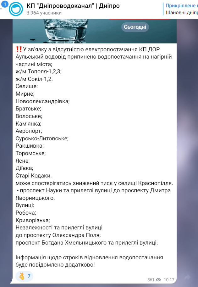 У КП "Дніпроводоканал" також повідомили, що у зв’язку з відсутністю електропостачання на КП "Аульський водовід" припинено водопостачання в нагірній частині міста: