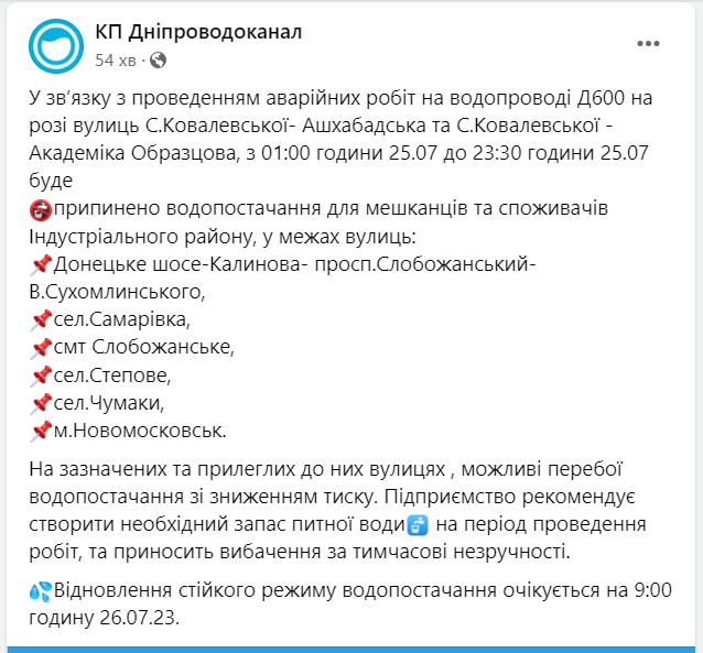 Через це з 01:00 до 23:30 25 липня буде припинено водопостачання для мешканців та споживачів Індустріального району у межах: