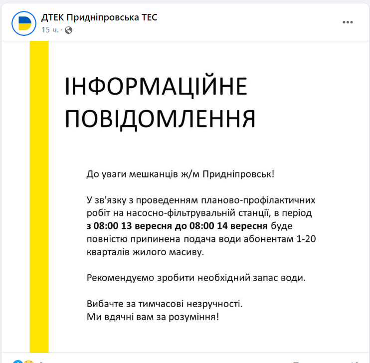 Деякі мешканці житлового масиву Придніпровськ з 8:00 13 вересня до 8:00 14 вересня залишаться без води.