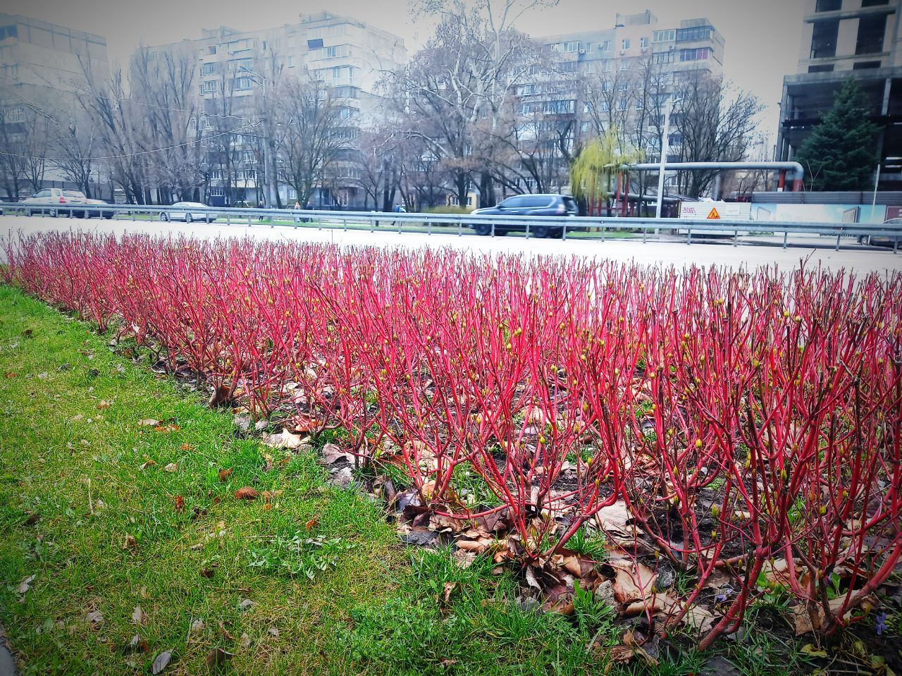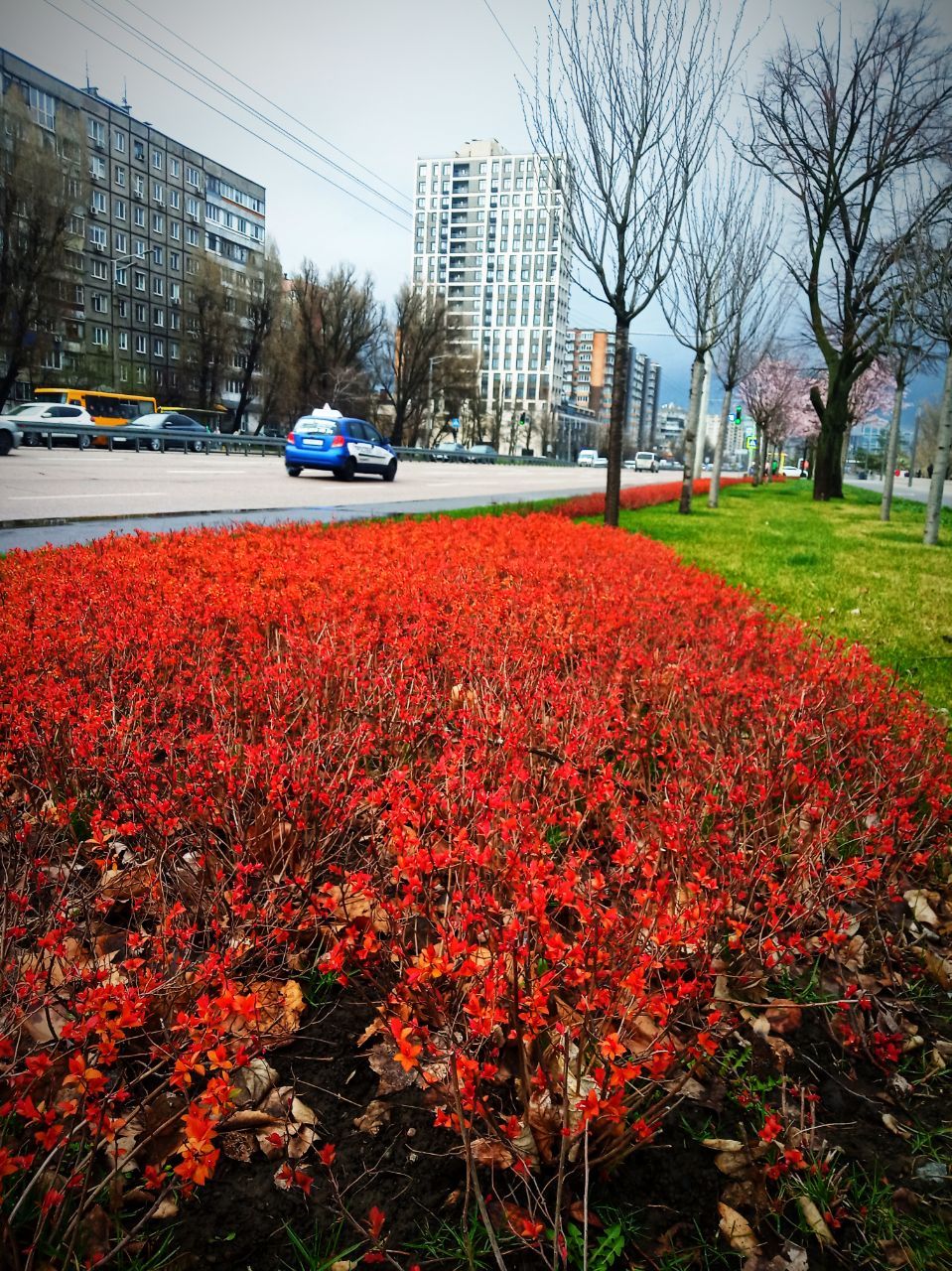 На Набережній Перемоги розквітнули багряні спіреї. Лінія з криваво-червоних міні-кущів тягнеться близько 300 метрів від скверу "Прибережного". Якщо будете гуляти на набережній, то зверніть увагу також на десятки сакур, які цього року розцвіли раніше.