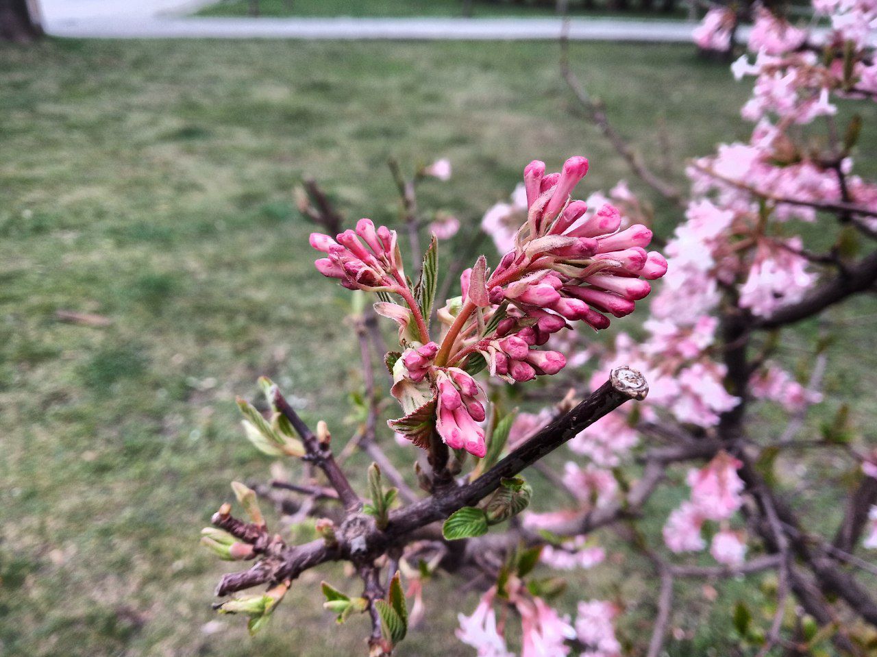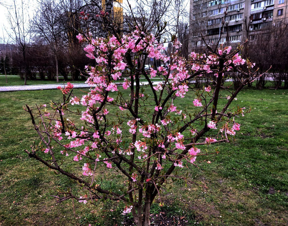 Поки всі чекають на теплу весну та сезон цвітіння сакури, на Перемозі розквітла рожева калина Фаррера, яка дуже нагадує японський символ цієї пори року. Декілька кущів знаходяться на бульварі Слави.