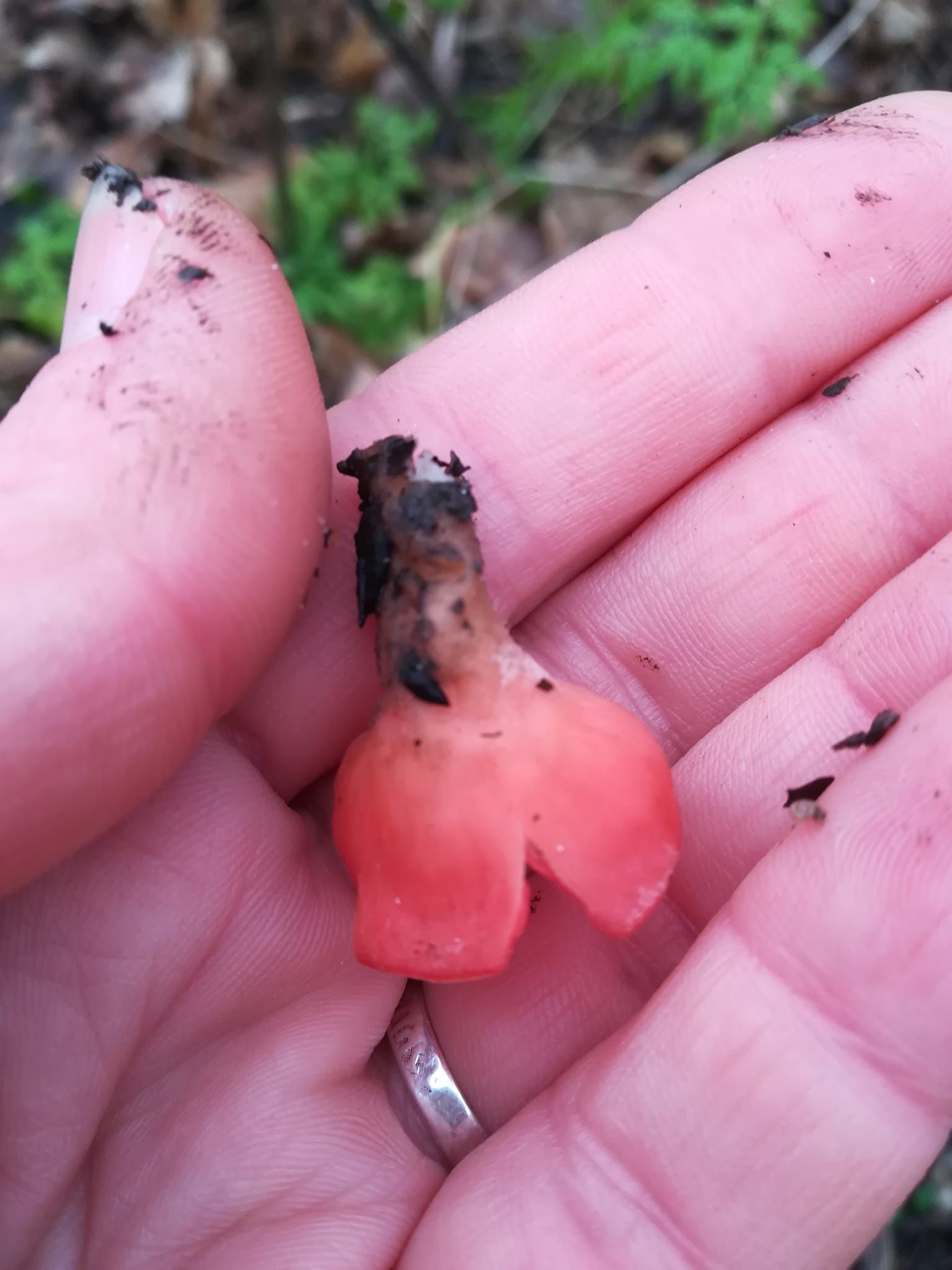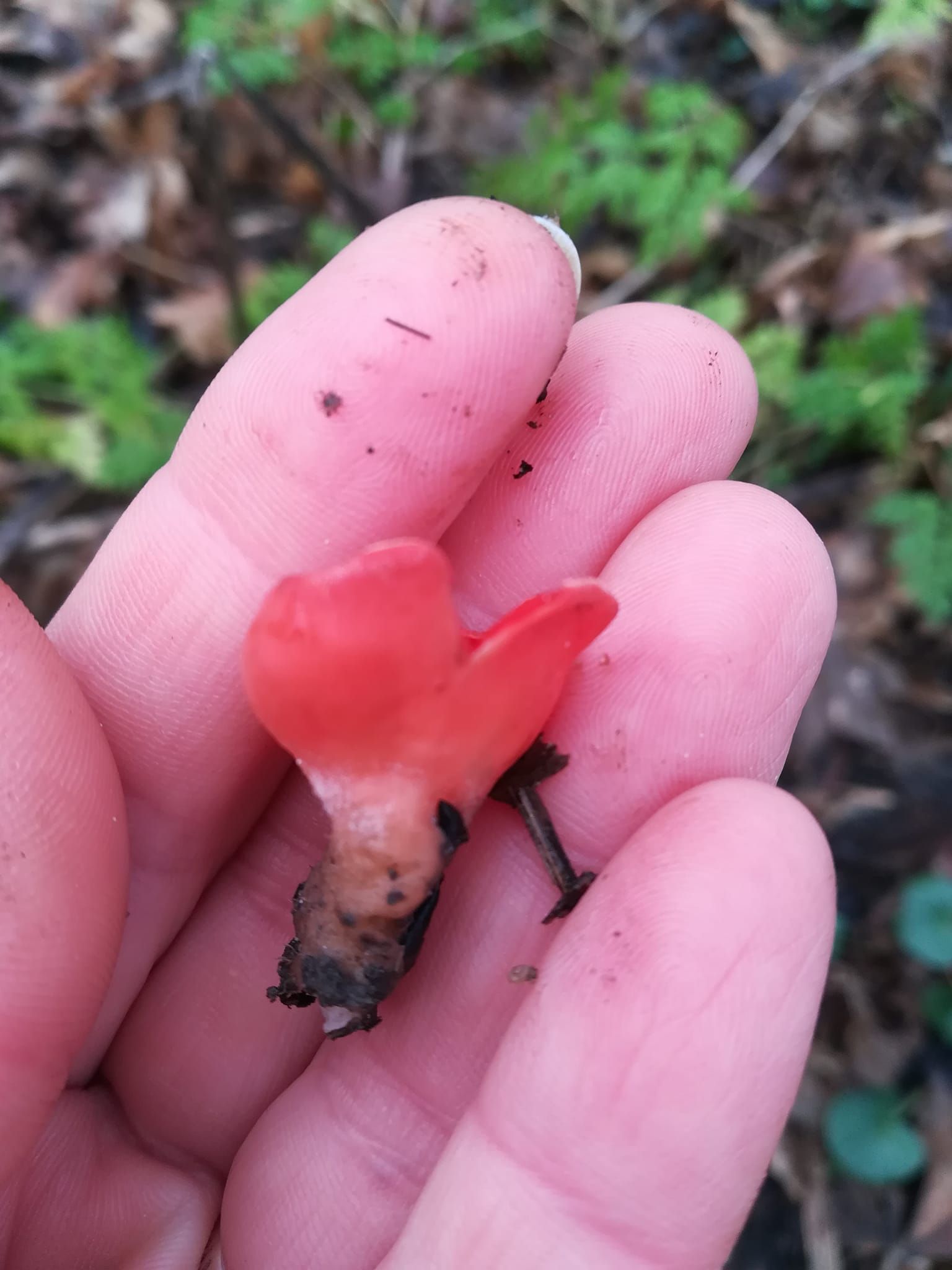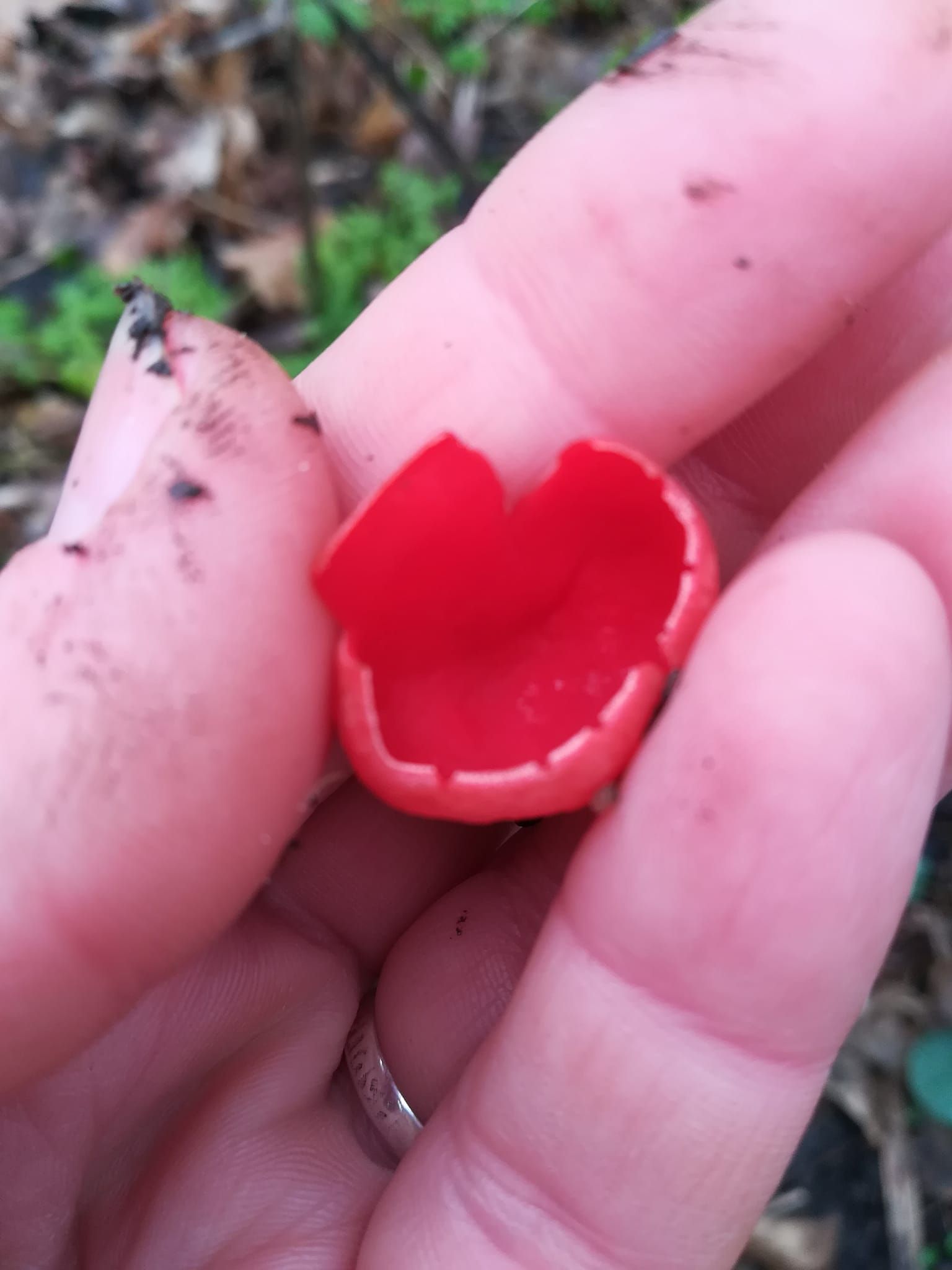 Хоча з першого погляду може здатися, що це лісова квітка або ягода, але ні - це гриб. Саркосцифа яскраво-червона, іноді має назву ельфійська шапка, ельфійська чаша (Sarcoscypha coccinea) — вид грибів роду саркосцифа (Sarcoscypha). Росте на відмерлій деревині, а з'являється зазвичай після сходження снігу у березні. Іноді його можна знайти взимку, якщо на вулиці тепло. Як і сталося цього року.