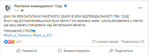 Як повідомили в повітряному командуванні "Схід", уночі над Дніпропетровщиною було збито п'ять ворожих ракет, шоста розірвалася у повітрі. Ще одну ракету ліквідували над Запорізькою областю.
