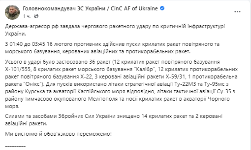 У свою чергу, головнокомандувач ЗСУ Валерій Залужний зазначив, що всього росіяни запустили 36 ракет (12 крилатих ракет повітряного базування Х-101/555, 8 крилатих ракет морського базування “Калібр”, 12 крилатих протикорабельних ракет повітряного базування Х-22, 3 керовані авіаційні ракети Х-59/31, 1 протикорабельна ракета “Онікс”). Вони цілилися по критичній інфраструктурі України.