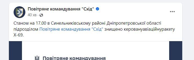 Повітряне командування "Схід" повідомило про збиття над Дніпропетровщиною ракети Х-69. Ворожу ціль знищили у небі на Синельниківським районом 24 квітня. Вибухи місцеві жителі чули о 17 години вечора.