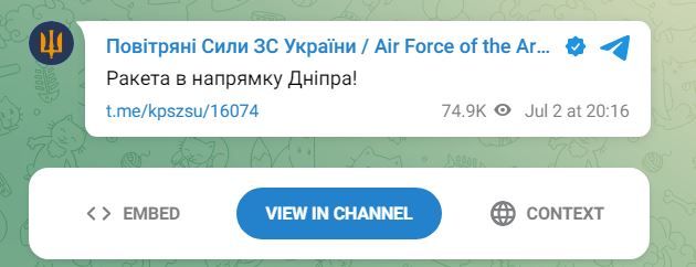 Під час однієї з тривог Повітряні сили ЗСУ повідомляли про ракету в напрямку Дніпра.