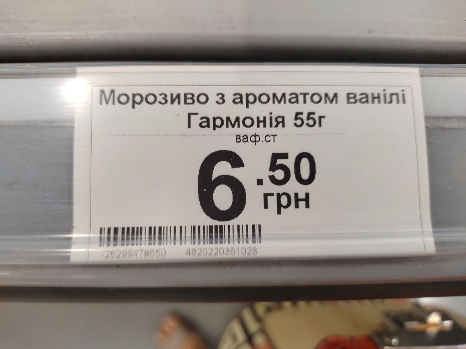 У магазині «Варус» пломбір з ароматом ванілі та вагою 55 грам продадуть за 6,50 грн. Ймовірно, це також власна марка магазину. Називається морозиво "Гармонія".