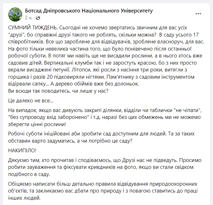 На випадок, якщо вас дивують закриті ділянки, відділи чи таблички "не чіпати", "без супроводу вхід заборонено" тощо. Наразі без цих обмежень ми не можемо зберегти цінні рослини! Робочі суботи ініційовані, аби зробити сад доступним для людей. Та за таких обставин варто задуматись, а чи потрібно це саду? НАКИПІЛО! - йдеться в повідомленні.